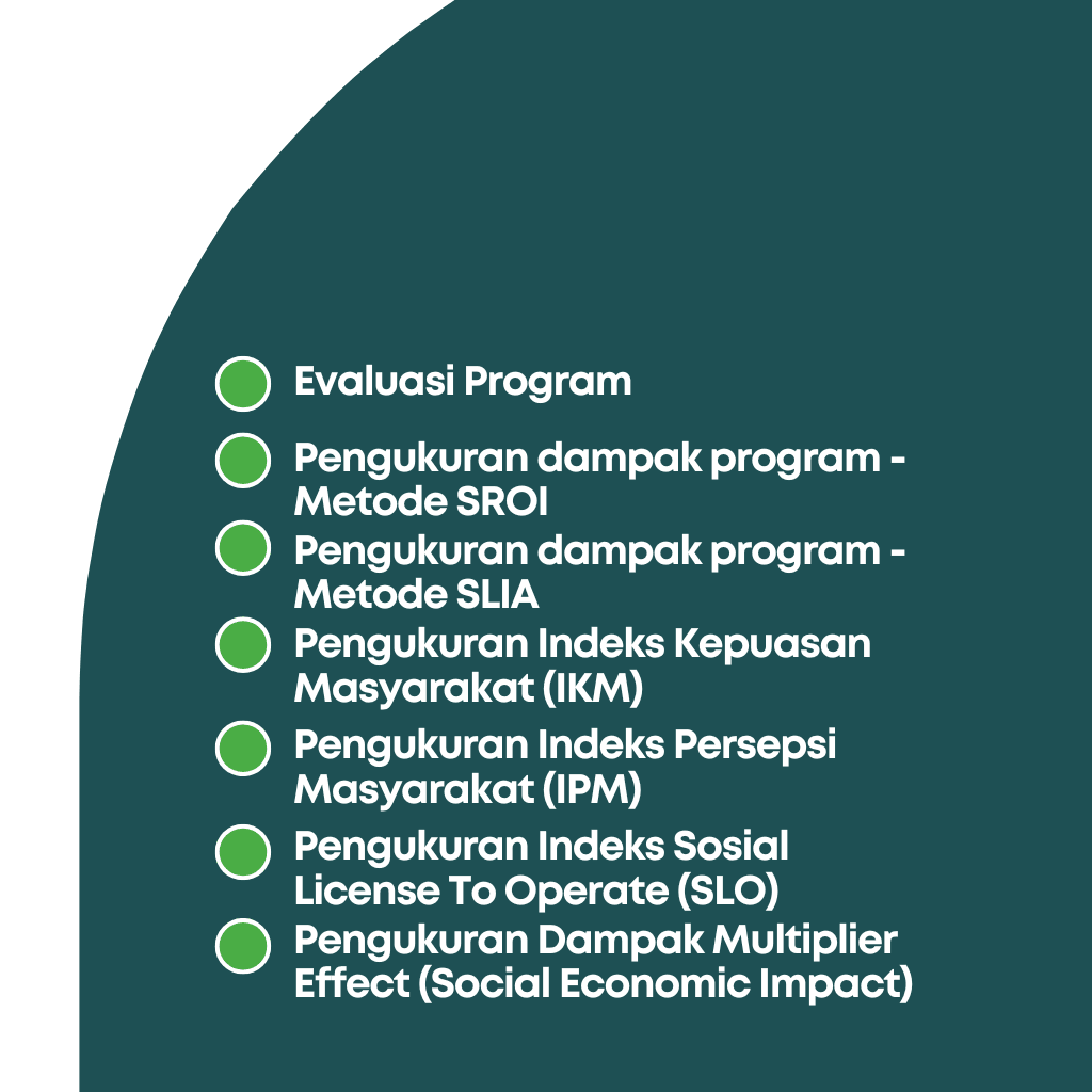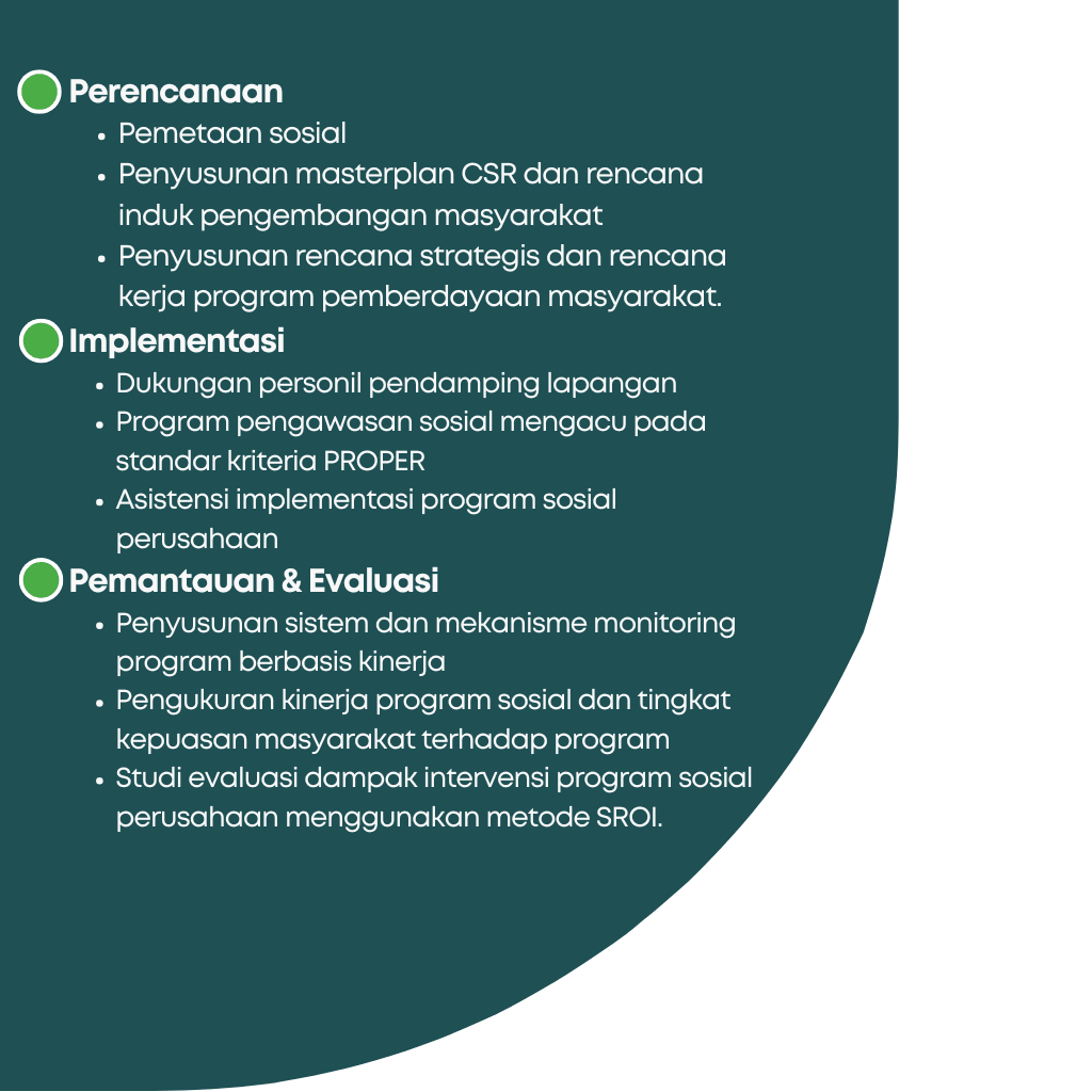 Kami memberikan layanan konsultasi komprehensif dalam perencanaan dan evaluasi program keberlanjutan. Tim ahli kami berpengalaman merancang program pemberdayaan masyarakat dan pengelolaan lingkungan yang berkelanjutan, serta mengukur dampak sosial, lingkungan, dan ekonomi secara menyeluruh. Semua layanan kami dirancang sesuai dengan regulasi yang berlaku.