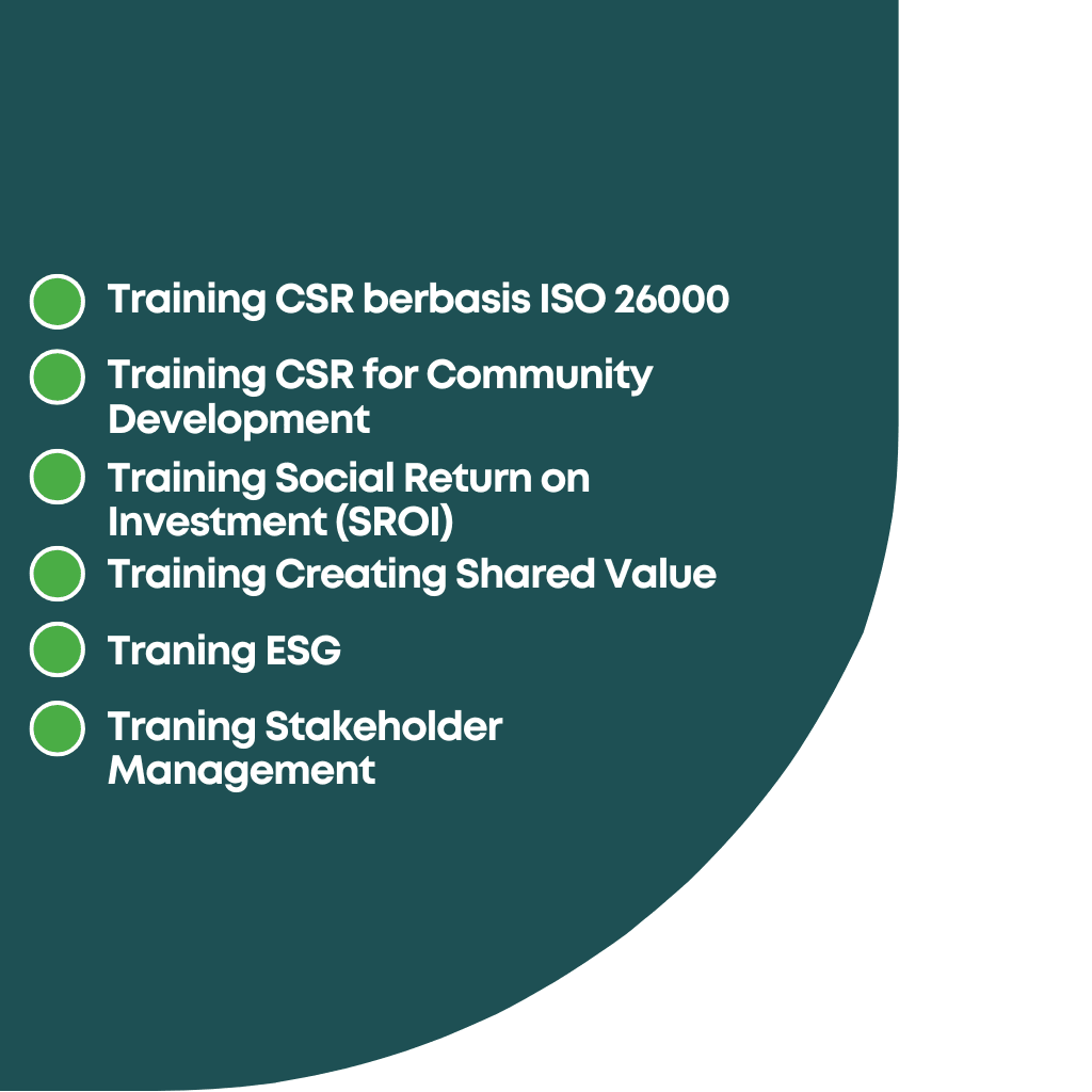 Kami menyediakan layanan pelatihan dan pengembangan yang komprehensif untuk membantu organisasi Anda mencapai tujuan keberlanjutan. Tim ahli kami dengan pengalaman luas dalam bidang CSR,ESG dan pelaporan keberlanjutan akan membekali Anda dengan pengetahuan dan keterampilan yang diperlukan untuk mengimplementasikan praktik bisnis yang berkelanjutan dan memberikan dampak positif bagi lingkungan dan masyarakat.